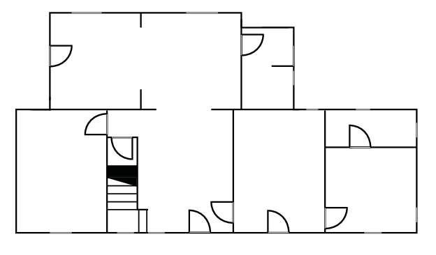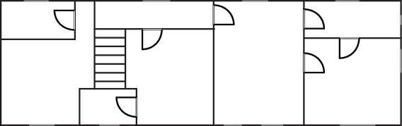 Tisch und Stühle, Schreibtisch und Stuhl, Treppe in den ersten Stock, Haupteingang.