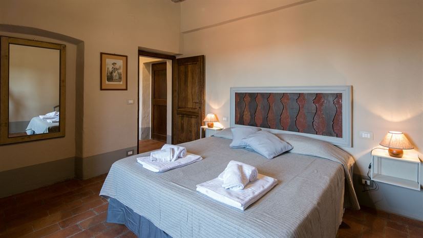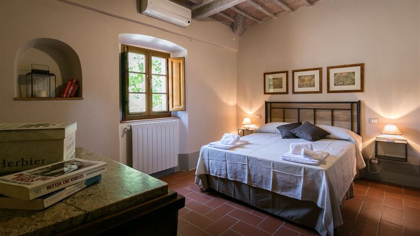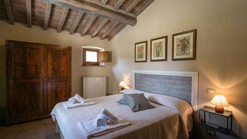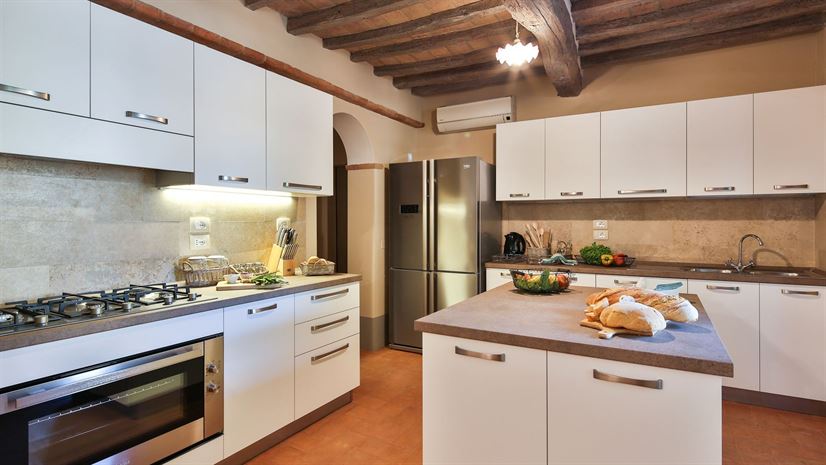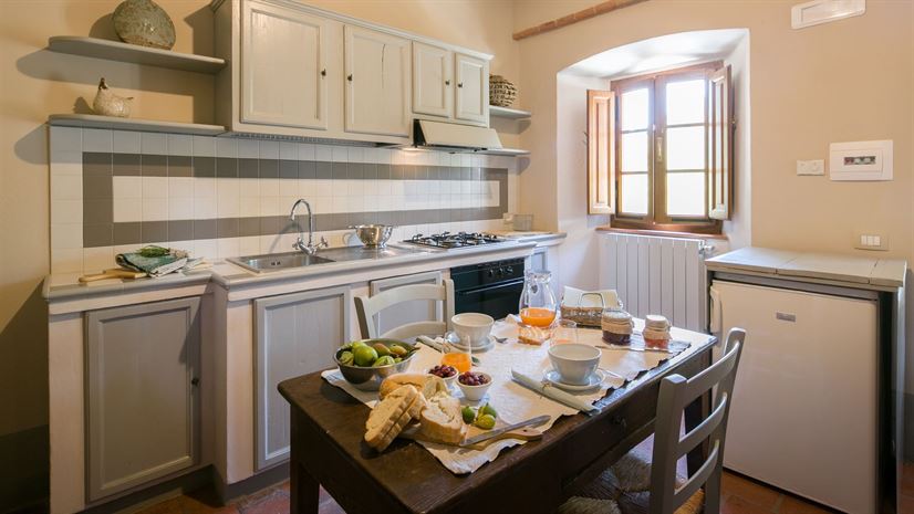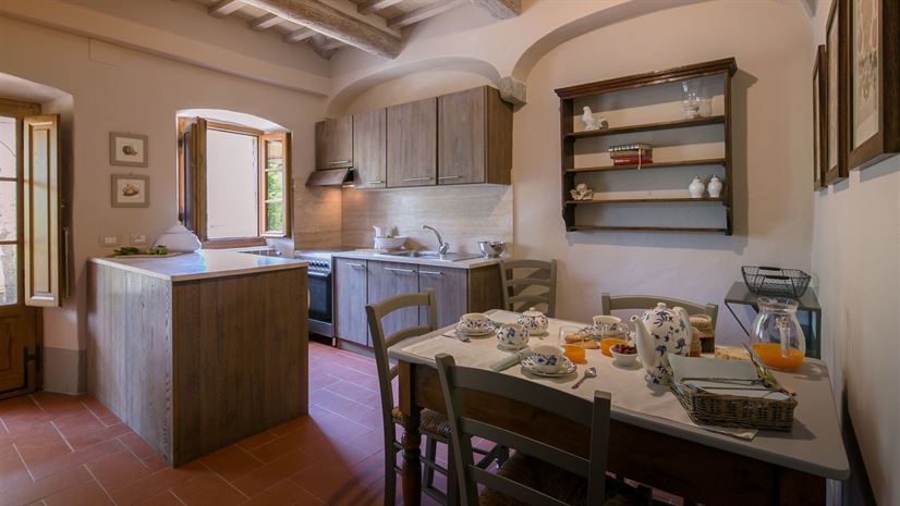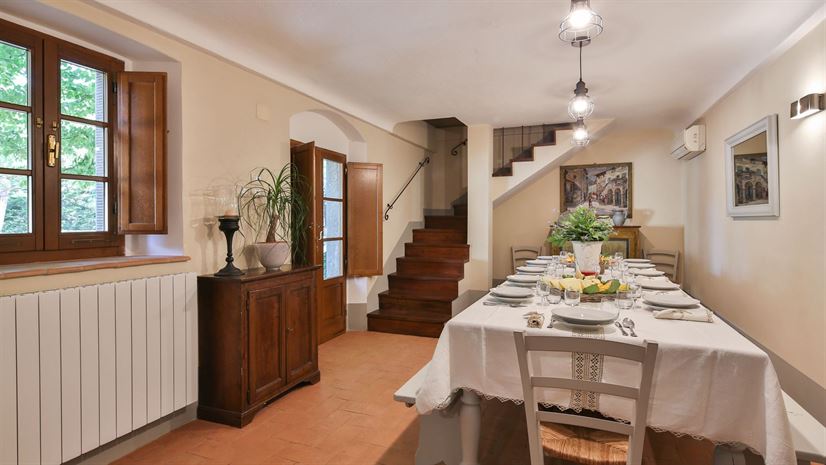 Im Inneren wurde das Haus mit viel Sorgfalt restauriert, wobei traditionelle toskanische Elemente wie Holzbalkendecken und Terrakottaböden erhalten geblieben sind. Sanfte, neutrale Wandfarben unterstreichen die warme und einladende Atmosphäre. Die großzügige Wohnküche bietet direkten Zugang zur Terrasse, was einen harmonischen Übergang zwischen Innen und Außen schafft. Für Gäste, die sich etwas mehr Privatsphäre wünschen, stehen zwei separate Apartments zur Verfügung, jeweils mit Küche und Essbereich, die über eine Außentreppe aus Stein an der Seite des Hauses erreichbar sind.