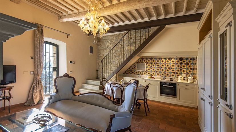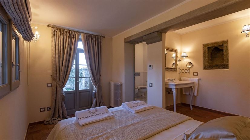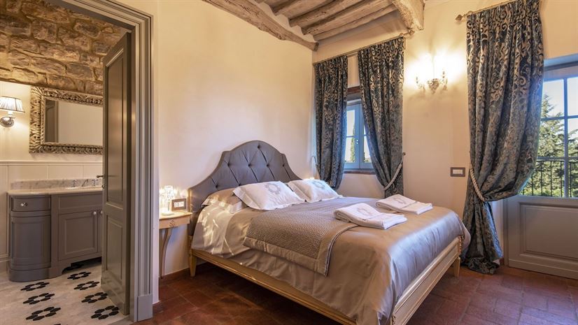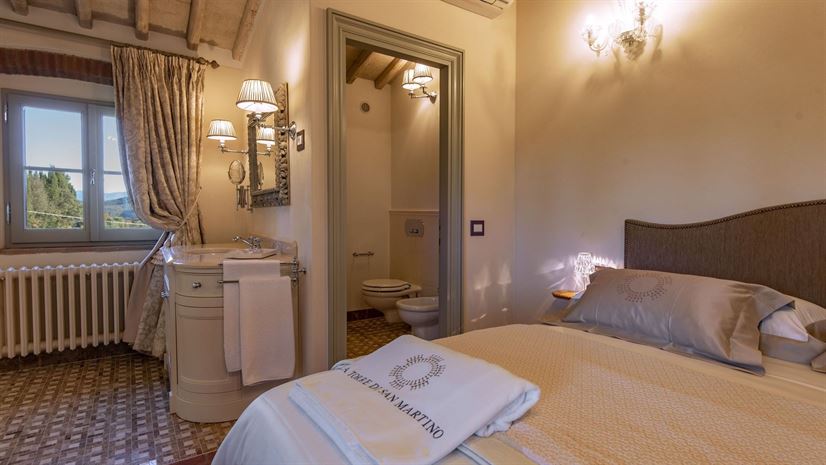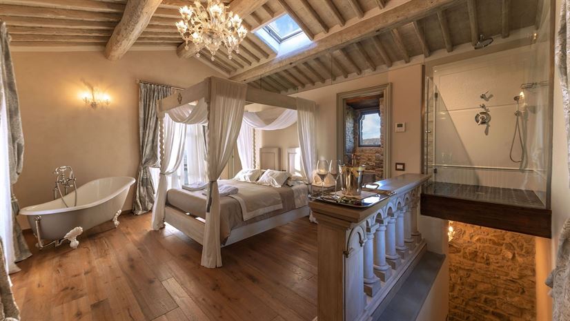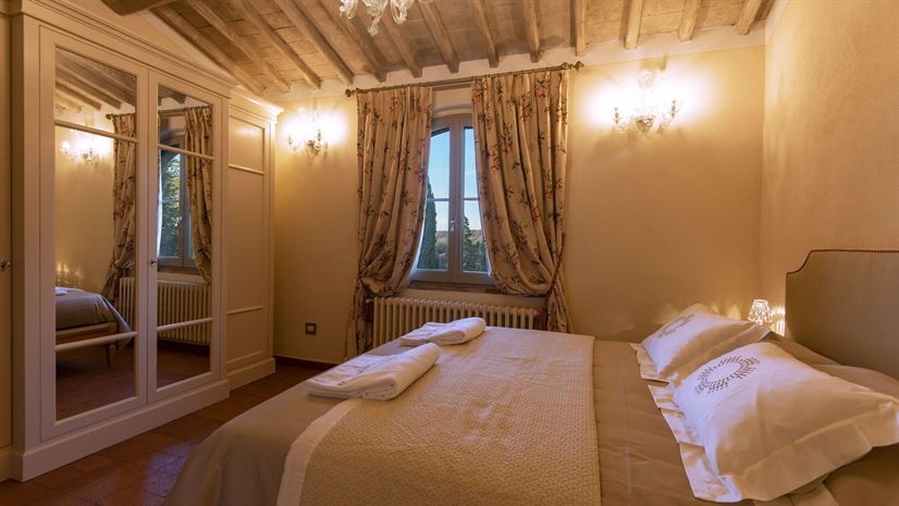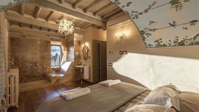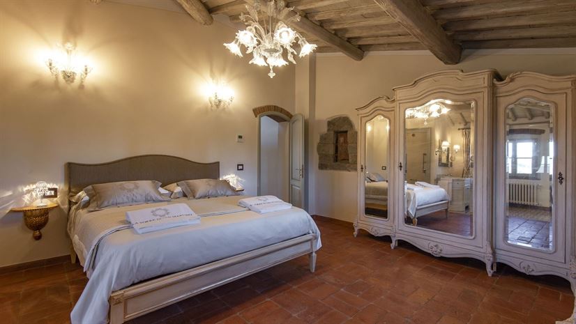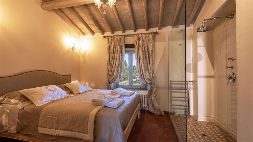 Im Inneren verbindet die Villa toskanische Elemente wie Holzbalkendecken, Terrakottaböden und Natursteinwände mit elegantem Mobiliar. Dezente Farben betonen die stilvolle Atmosphäre. Besonders eindrucksvoll ist das Turmschlafzimmer mit einzigartig gestaltetem Duschbereich und atemberaubendem Blick. Ergänzt wird das Angebot durch einen kleinen Wellnessbereich mit Sauna und Jacuzzi.