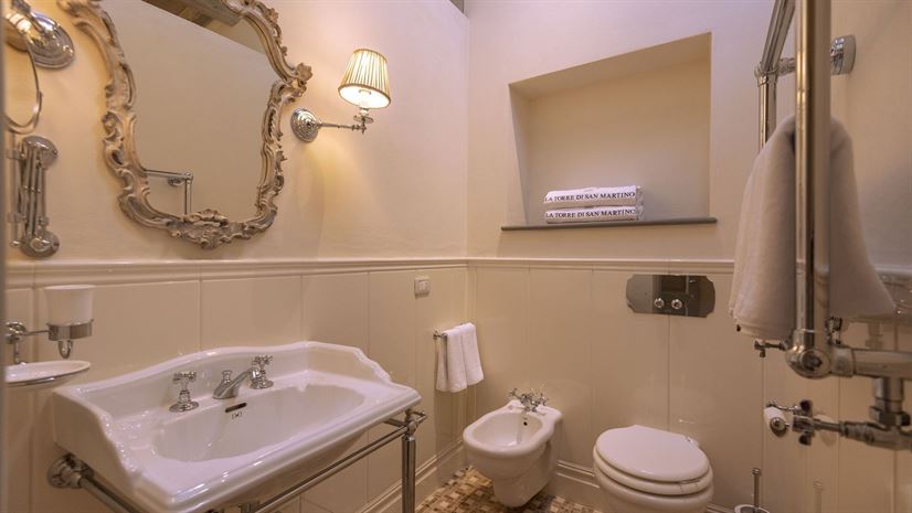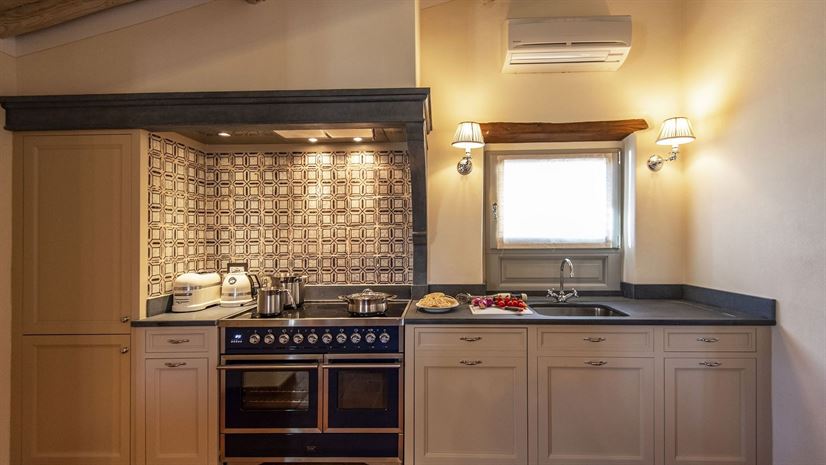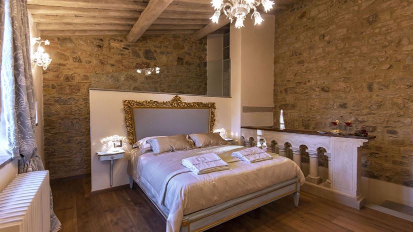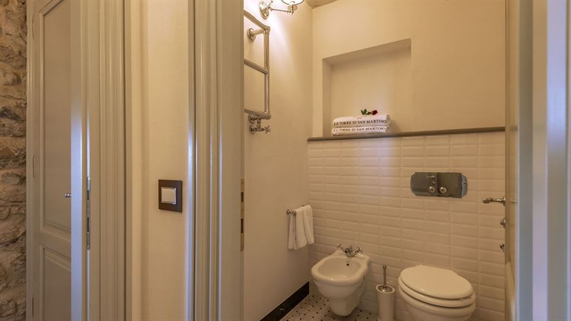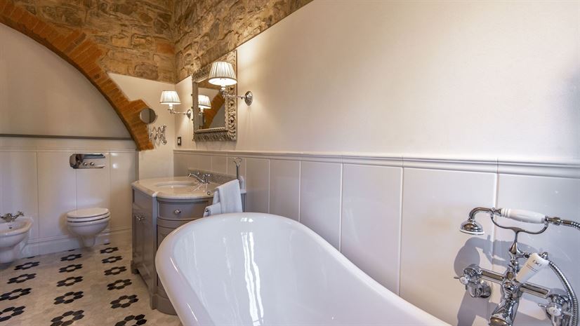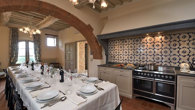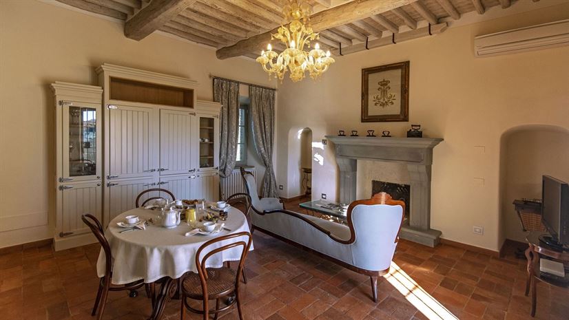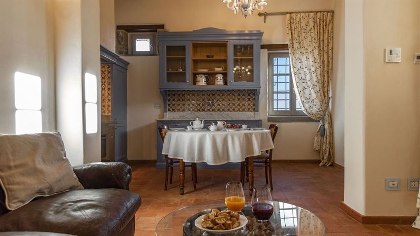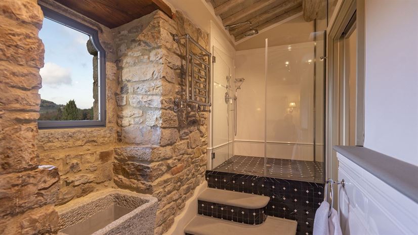 Im Inneren verbindet die Villa toskanische Elemente wie Holzbalkendecken, Terrakottaböden und Natursteinwände mit elegantem Mobiliar. Dezente Farben betonen die stilvolle Atmosphäre. Besonders eindrucksvoll ist das Turmschlafzimmer mit einzigartig gestaltetem Duschbereich und atemberaubendem Blick. Ergänzt wird das Angebot durch einen kleinen Wellnessbereich mit Sauna und Jacuzzi.