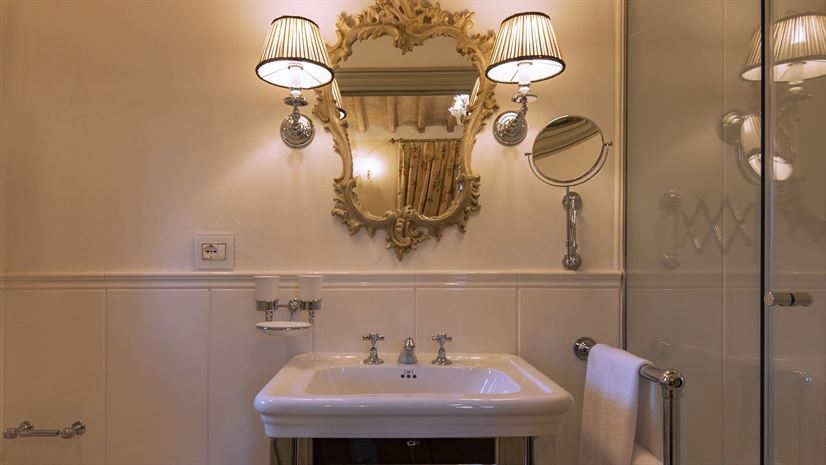 Himmelbett (welches nicht in zwei Einzelbetten umgestellt werden kann), Kleiderschrank, Badewanne, Klimaanlage.