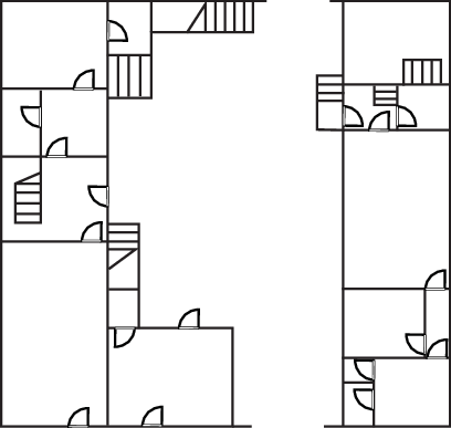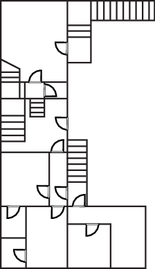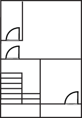 Chairs, table, wooden chest, side table, fireplace (decoration only), fan, door to external stone staircase.