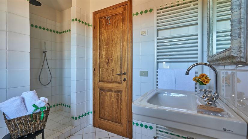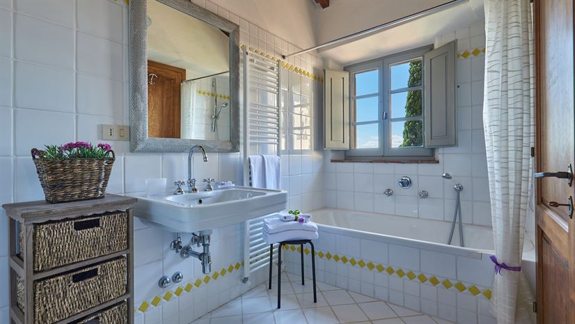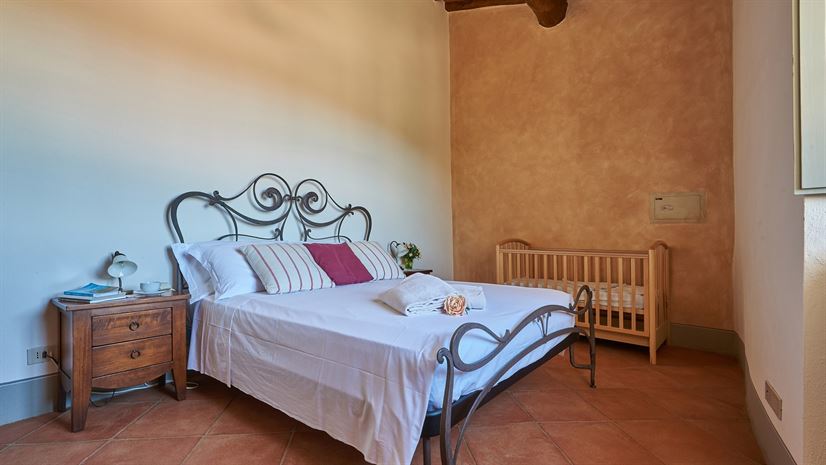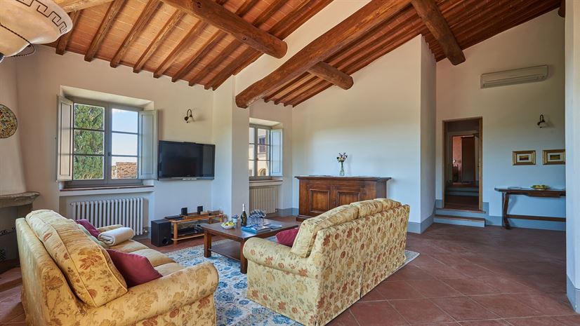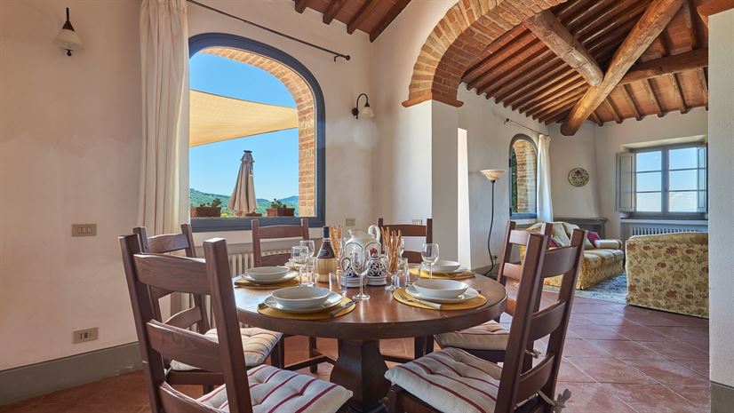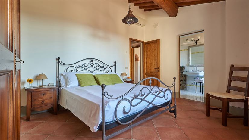 Eine geräumige Ferienwohnung im zweiten Stock, deren schöne Einrichtung eine Mischung aus traditionell-toskanischen Stilelementen und modernen Einrichtungen darstellt. Dazu gehört auch eine große, sonnige Terrasse mit atemberaubender Aussicht - der ideale Ort für ein gemeinsames Essen!