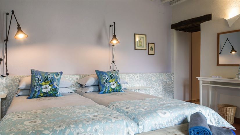 Doppelbett (welches in zwei Einzelbetten umgestellt werden kann), Kleiderschrank, Bank, Stuhl, Klimaanlage.