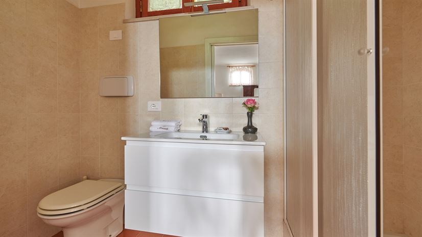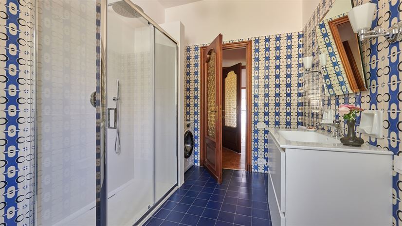 Dusche, Doppelwaschbecken, Bidet, WC, Waschmaschine.